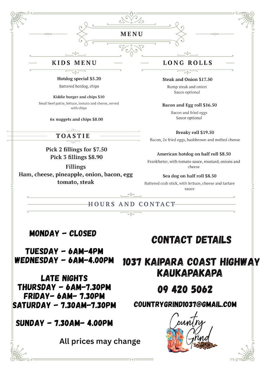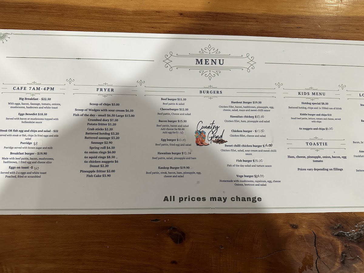 Don't miss the Breakfast Burger, a favorite among regulars, or opt for a filling Steak or Fish with Eggs for just NZ$22.00. Families will appreciate the Kiddo Menu, featuring tasty options like the Kiddie Burger and Hot Dog Special. With a cozy setting and satisfied customers singing its praises, from the flavorful burgers to the inviting staff, Country Grind truly delivers an unforgettable dining experience.